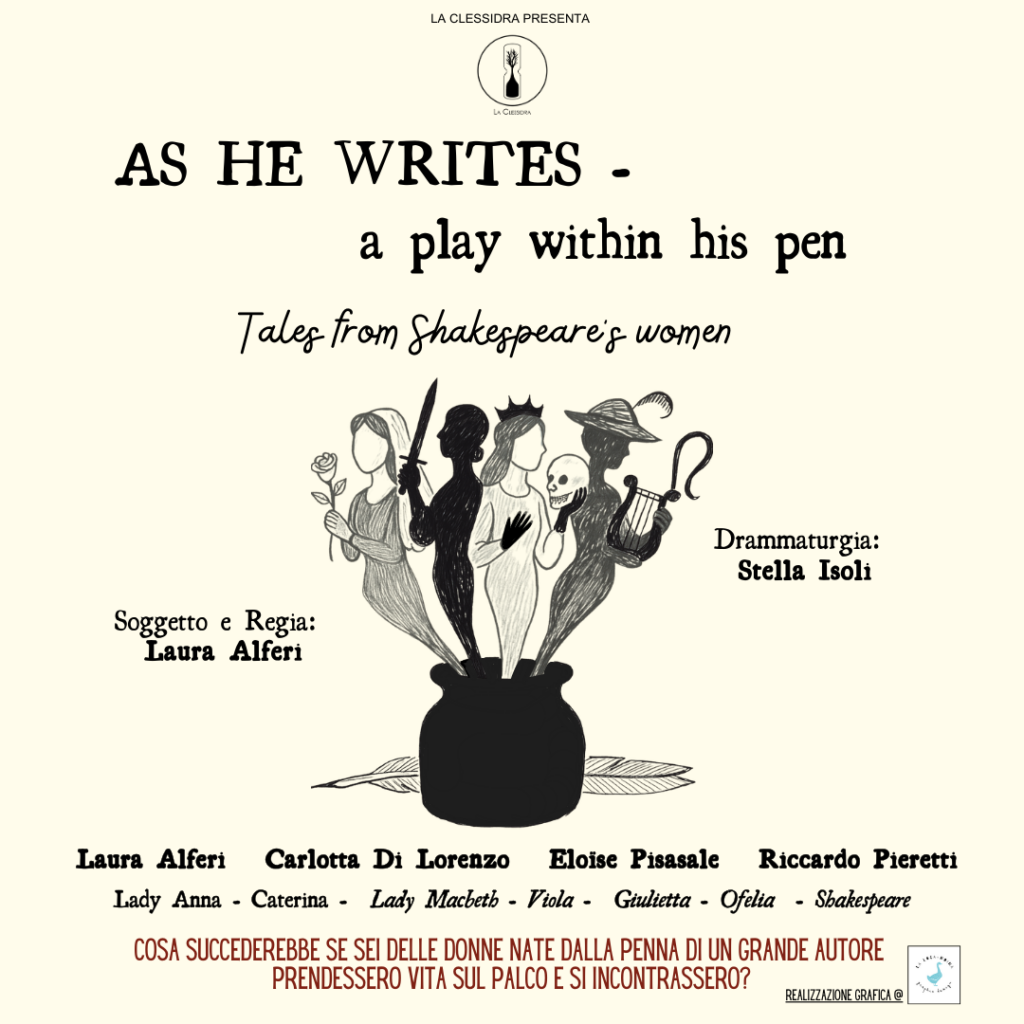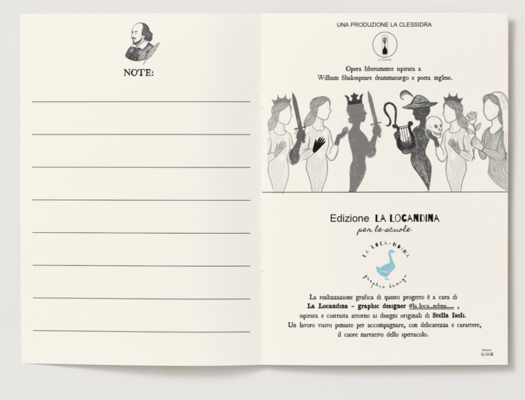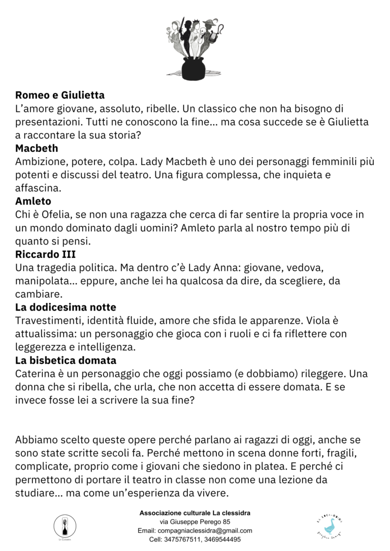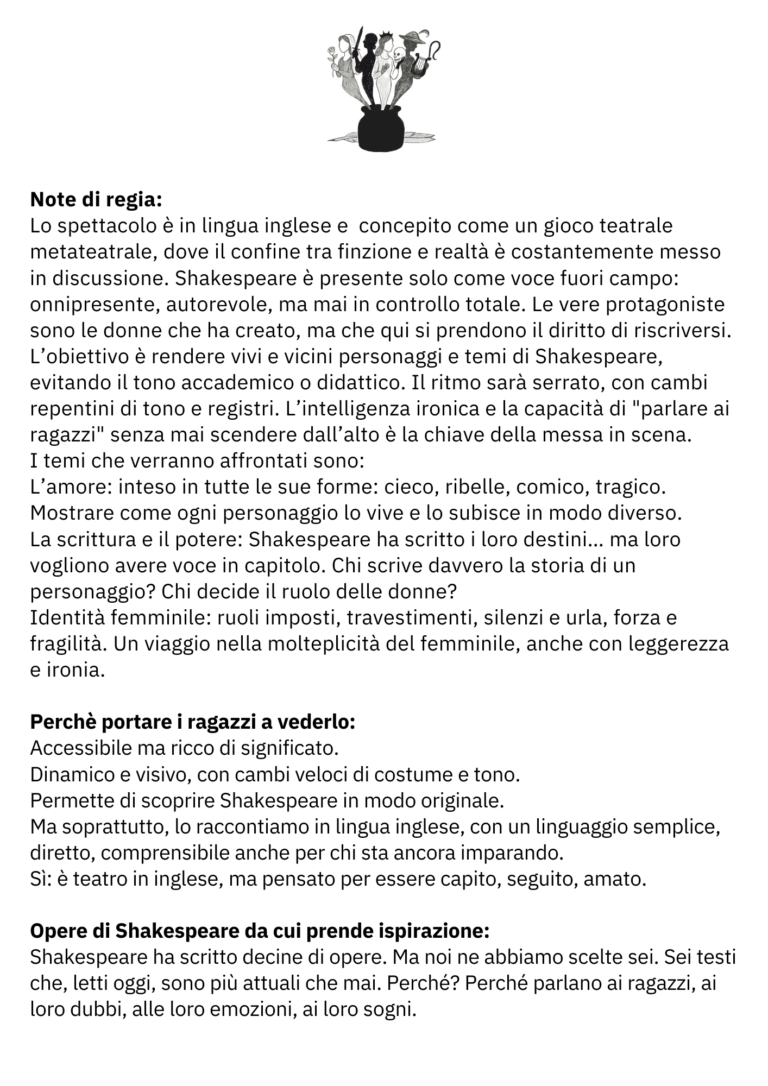 Tre attrici interpretano sei celebri personaggi femminili di William Shakespeare.Mentre l’autore scrive, le donne da lui create prendono vita… e decidono di raccontarsi da sole. Libretto riassuntivo da distribuire agli alunni