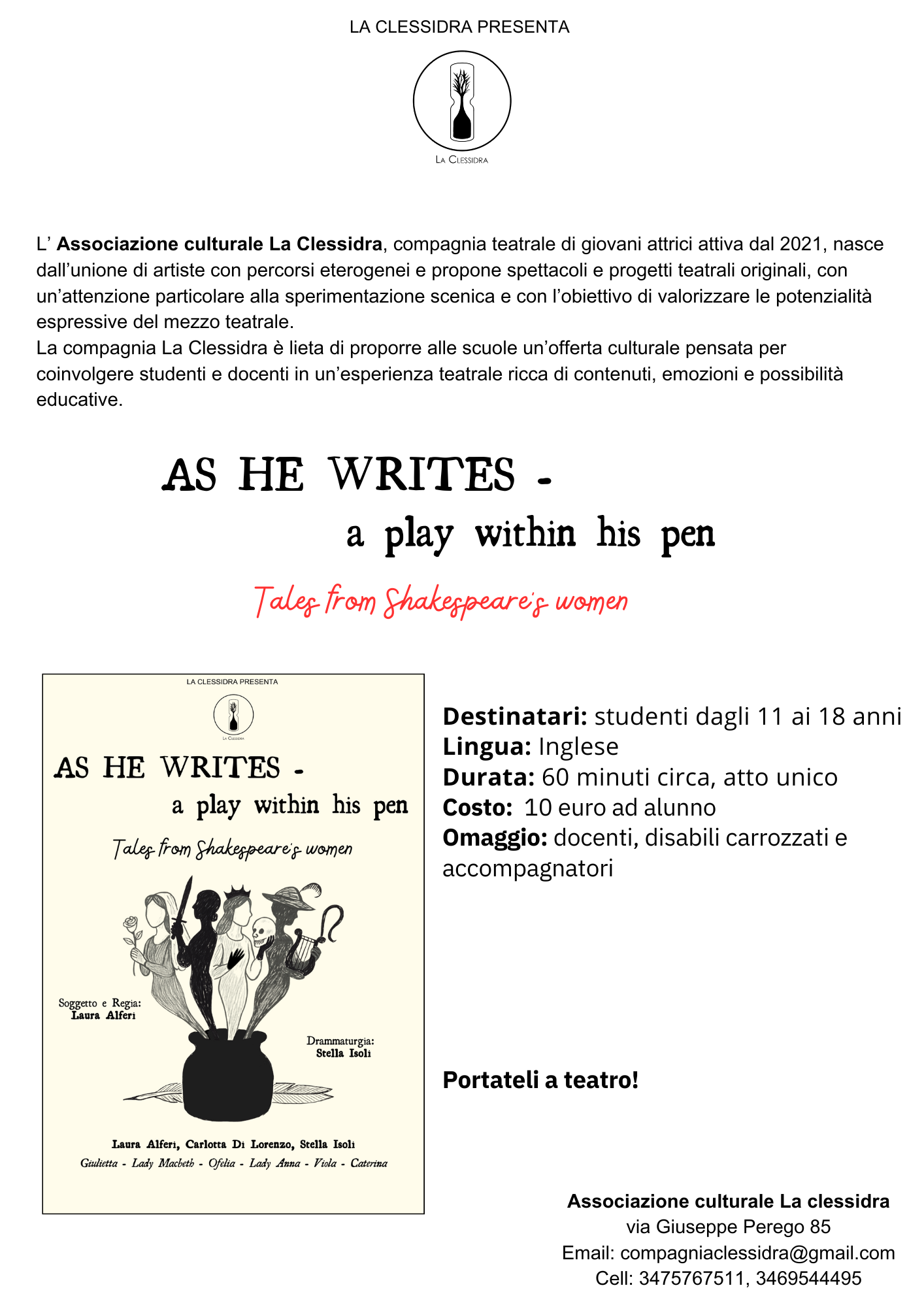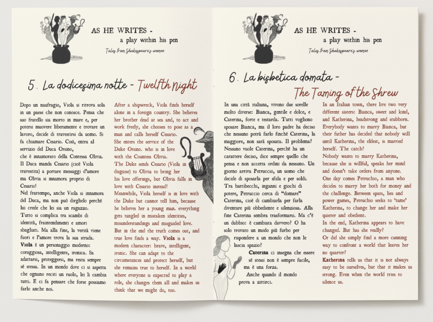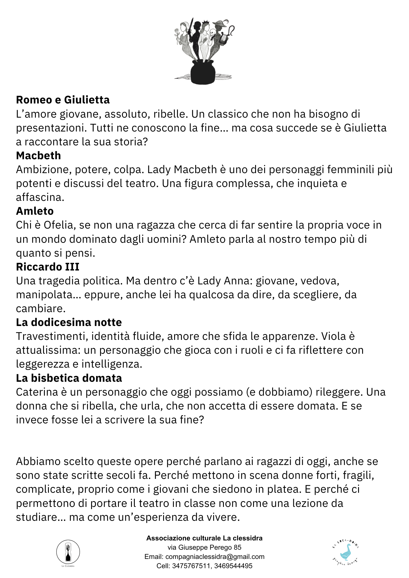 Tre attrici interpretano sei celebri personaggi femminili di William Shakespeare.Mentre l’autore scrive, le donne da lui create prendono vita… e decidono di raccontarsi da sole. Libretto riassuntivo da distribuire agli alunni